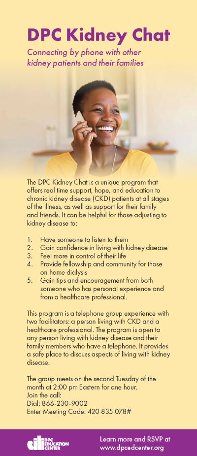 The Kidney Chat is intended as a safe place to discuss aspects of living with kidney disease and connect with fellow patients in the kidney community. Additional information is online at https://www.dpcedcenter.org/resources/dpc-kidney-chat/